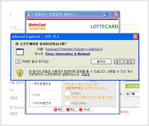 카드결제등 암호화 기술등이 고려된 페이지에서는 다음과 같은 화면이 뜨며, 이를 설치하지 않을경우는 결제과정을 진행할 수 없습니다. |